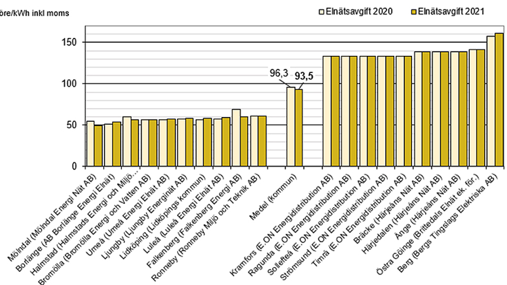I undersökningen har den årliga elnätsavgiften, enligt de priser som gällde den 1 januari 2021, beräknats för typhuset i Nils Holgerssonrapporten med 15 lägenheter. Varje lägenhet har ett 16A säkringsabonnemang och en årlig elförbrukning på 2 300 kWh. Huset har ett gemensamt fastighetsabonnemang på 35A och 15 000 kWh/år. För varje huvudort i kommunen har ett medelvärde redovisats i öre/kWh inklusive moms utifrån den totala elnätskostnaden för typhuset den 1 jan 2021. Energiskatten för el som finns med på fakturan från elnätsföretagen är inte inkluderad.