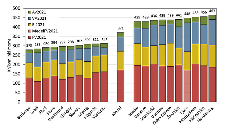 Skillnaden är stor mellan Sveriges kommuner. Bilden nedan visar kostnaden per kvadratmeter och år för fjärrvärme, el, vatten och avlopp (VA) samt avfall i de 10 billigaste och 10 dyraste kommunerna i landet samt för medelkommunen.