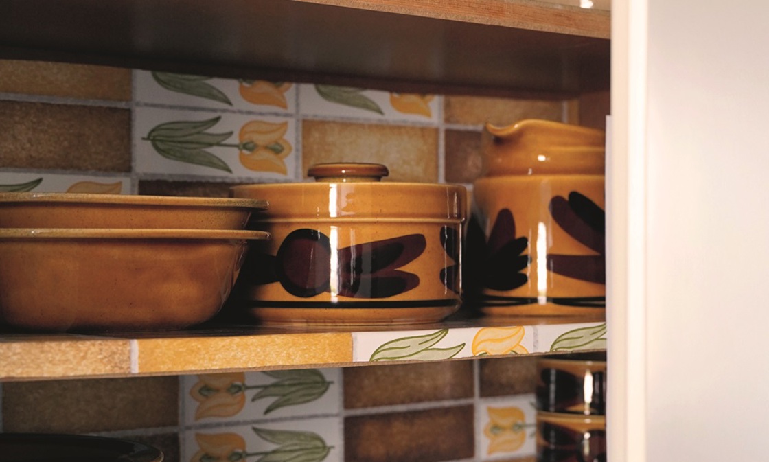 Museilägenheten har originalkök med lejongult, tidstypiskt porslin i skåpen.