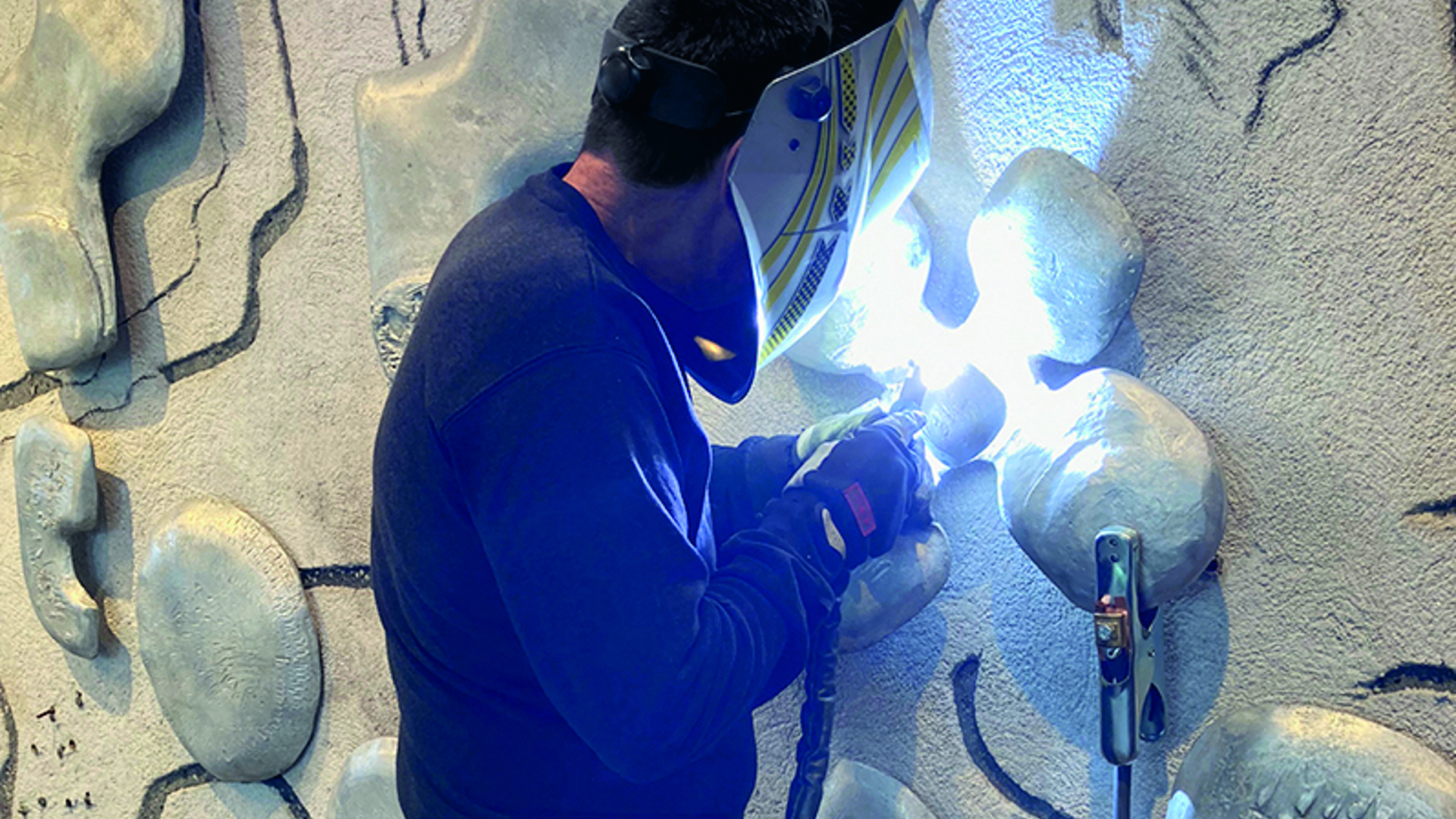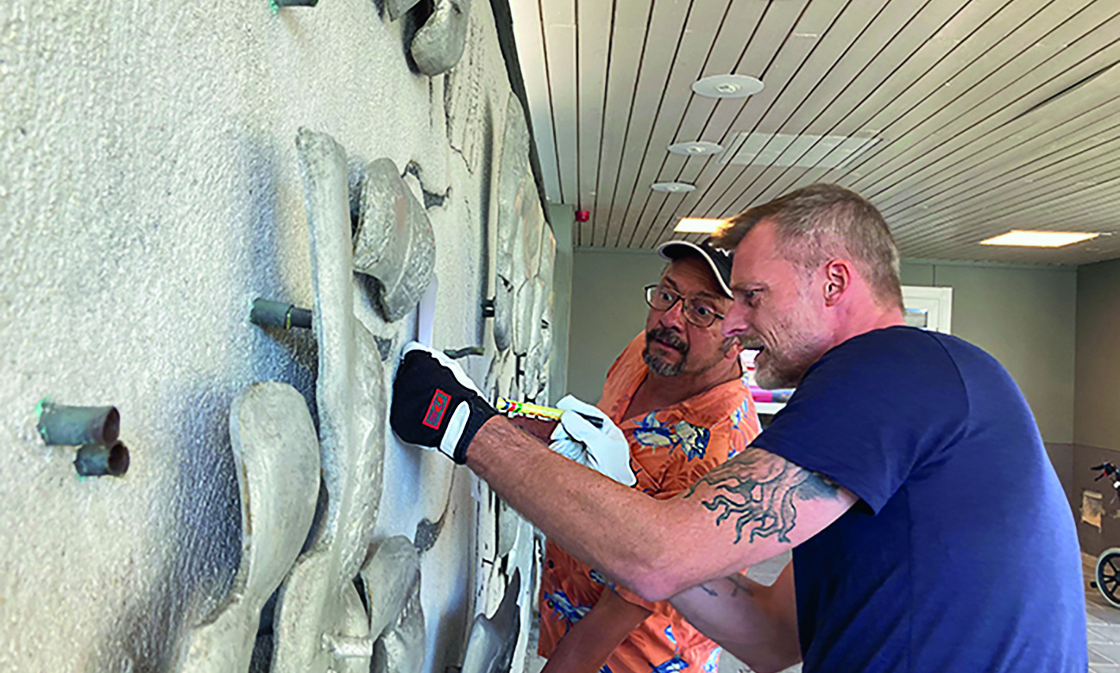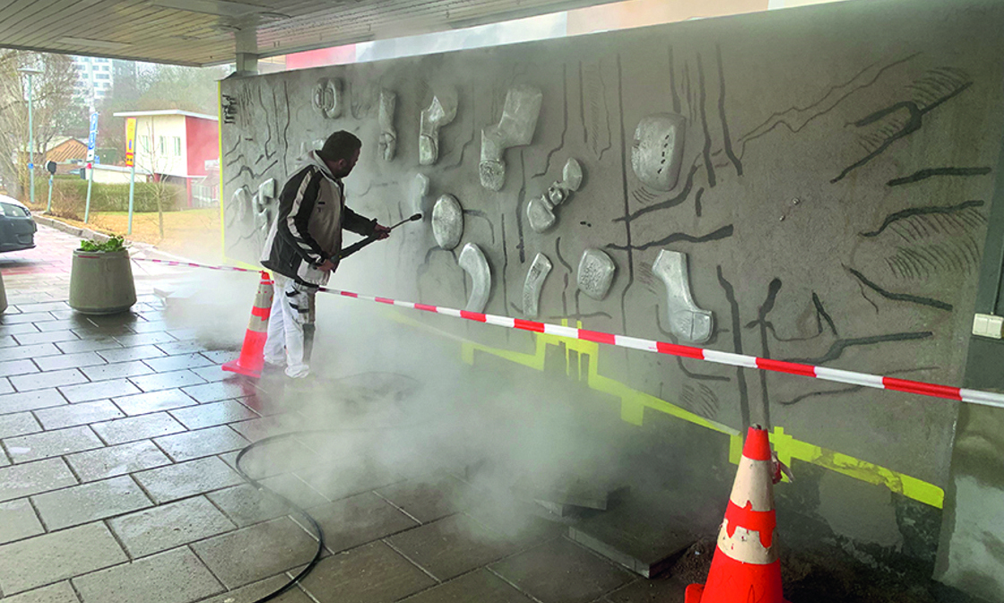 Hantverkare från betong- och putsentreprenören rengör konstverket.