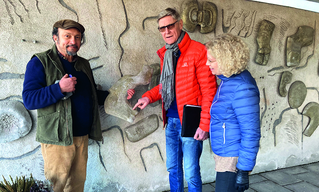 Marco Cueva inspekterar konstverket inför arbetet tillsammans med Ludwig Hedlund och Gunlög Sundberg från föreningens projektgrupp.