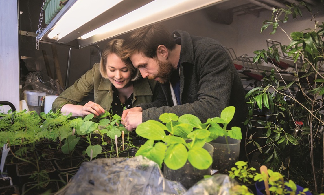 Cykelrummet har tillfälligt fått lämna plats åt växtbelysning och årets försådder. Amanda Larsson och Johan Wadsö pysslar med de späda skotten.