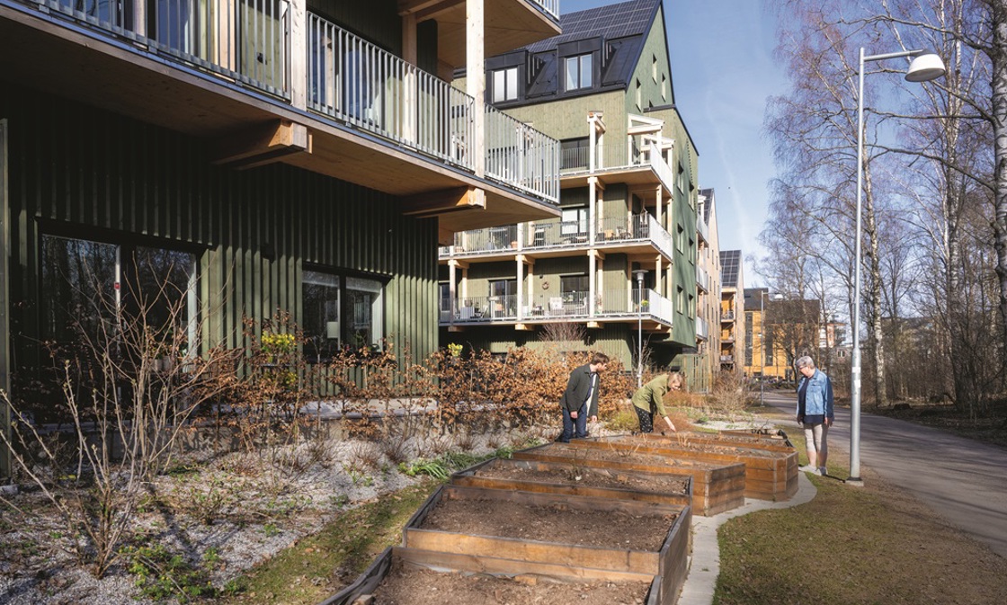 Odling känns helt  naturligt i den här föreningen. Här står hållbarhet i fokus på alla sätt. Husen är Svanenmärkta moderna passivhus, vilket innebär att de är både miljö- och energicertifierade. De är byggda i trä och har solceller på taken och de boende har tillgång till elbilspool, eldrivna lådcyklar och ett kylrum för livsmedelsleveranser.