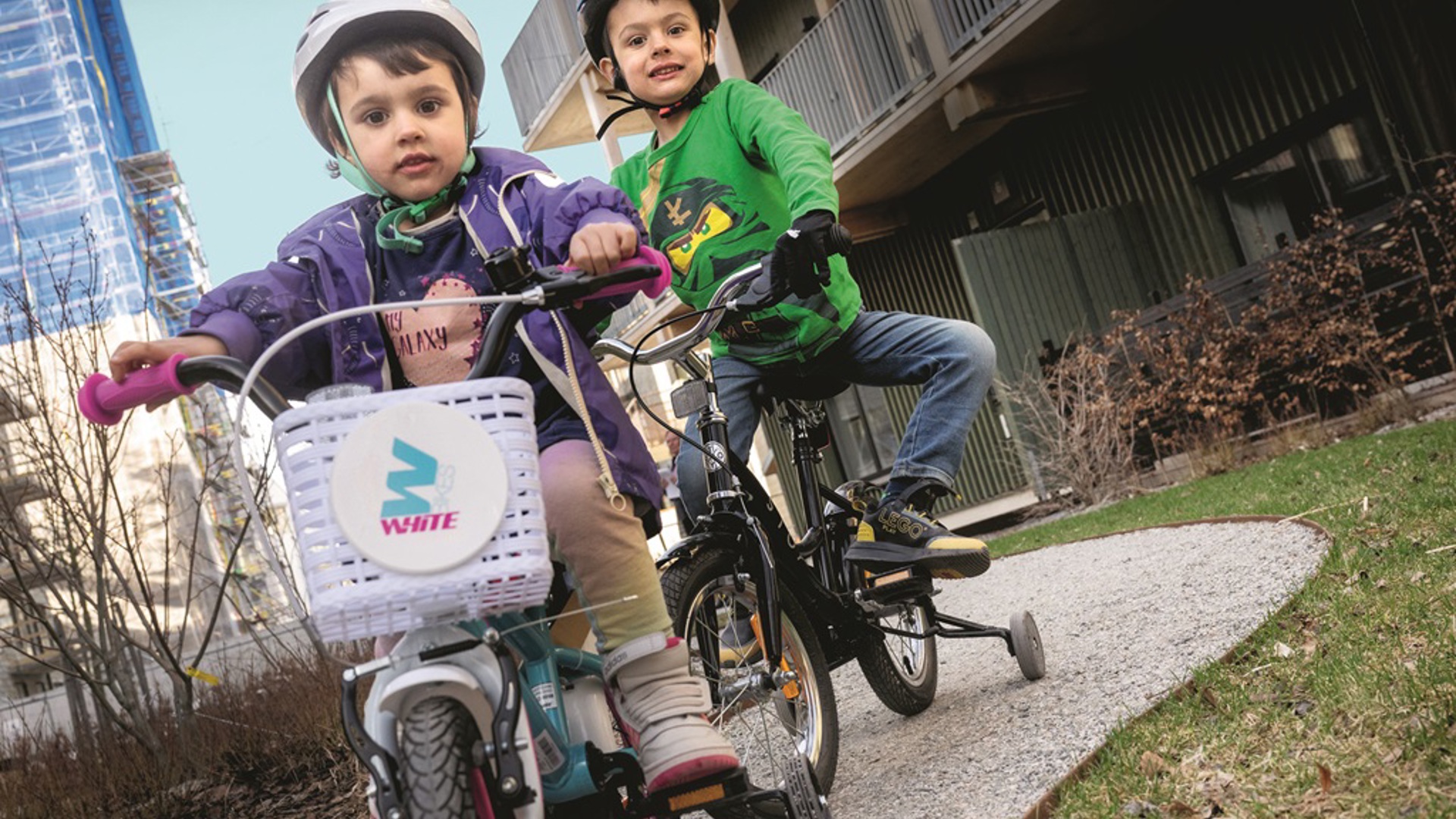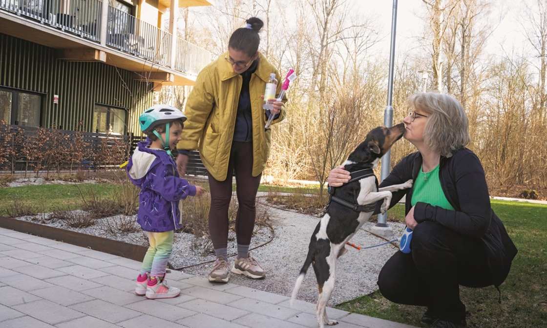 På den slingriga stigen mellan husen cyklar Luka, 5 år, och Izzie, 3 år, på sina små cyklar. När Karin Engström kommer med Felix blir glädjen stor och barnen turas om att klappa. Föräldrarna Klara och Marcus Thepper berättar att de flyttade till sin stora fyra högst upp i ett av husen från ett litet radhus i en annan del av stan.