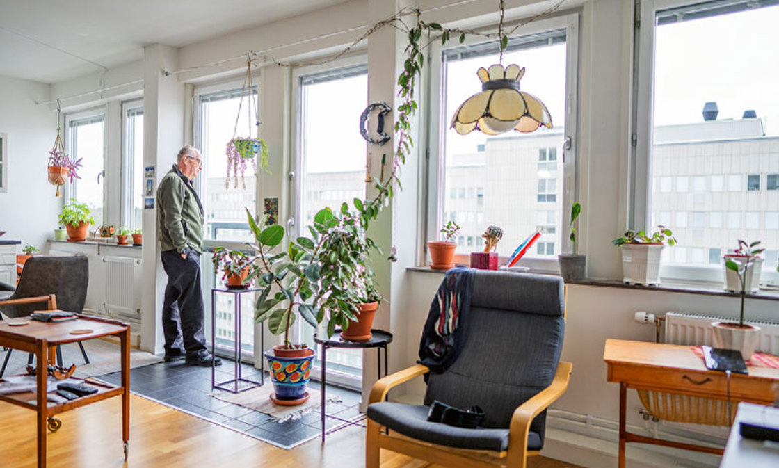 Lasse Tobiasson har en lägenhet i österläge på nionde våningen. Utsikten var en av de saker som drog honom till huset, en annan är att hans syster bor i lägenheten bredvid.