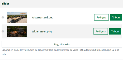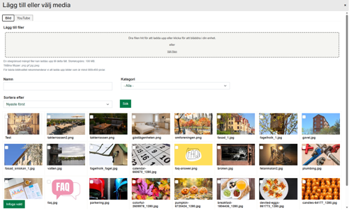 Aktivera bokningsfunktionen som ett nytt alternativ under Lägg till och Hantera innehåll. Välj en länktext som syns i meny samt en brödtext som är en allmän beskrivning. Läs mer under Bokningsfunktion - Inställningar för bildgalleri