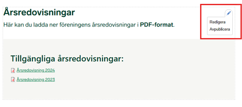 För att kunna lägga till, ta bort eller uppdatera innehåll på föreningens webbplats måste du LOGGA IN som redaktör. Endast inloggade användare kan göra förändringar. Inloggningspuffen ser ut så här: