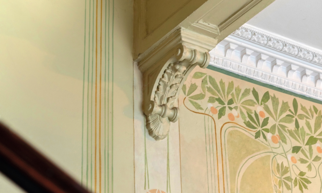 – Vi har restaurerat väggarna här. De tog fram den gröna tapeten så långt det gick och gjorde sedan schabloner av den så att de kunde återskapa mönstret, berättar Per Johansson.