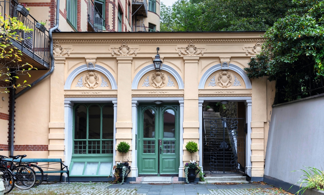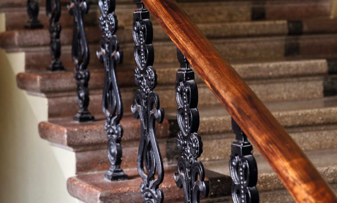 I serien går restauranggästerna in först genom de smidda grindarna och sedan de gröna dörrarna för att komma in i restaurangdelen, men när vi går samma väg hamnar vi i själva verket i en vacker trappuppgång med smidesräcke och väggar målade i grönt.