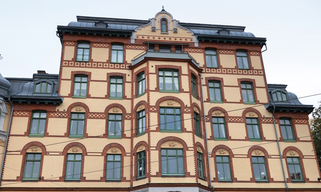 – För sju år sedan renoverades fasaden, det tog rätt lång tid att både putsa och måla om. Taket är också bytt och fönstren håller på att renoveras, säger han.