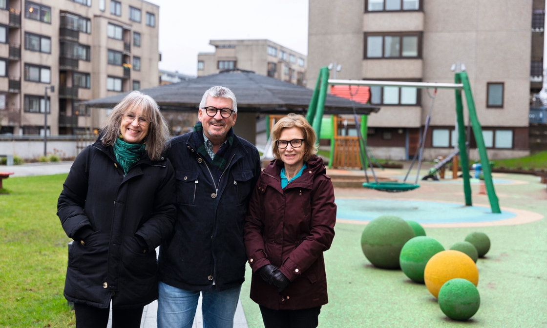 Ulla Berg, kassör, Bengt-Arne Svensson, ledamot, och Bodil Lidman, ordförande i Brf Nordostpassagen, framför den färdigställda och flitigt nyttjade lekplatsen Svampen.