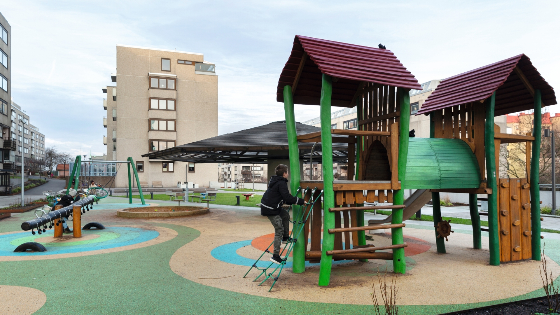Numera är det ofta barn på lekplatsen och många ungdomar använder dessutom ytan för att köra skateboard på – vilket de är välkomna att göra. Intill lekplatsen finns också en grillplats och ett soldäck med inbyggda solsängar.