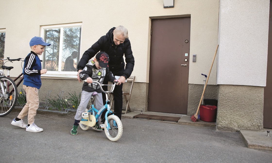 Olena Galov hjälper barnbarnen Olesja och Denis att lära sig cykla på innergården.