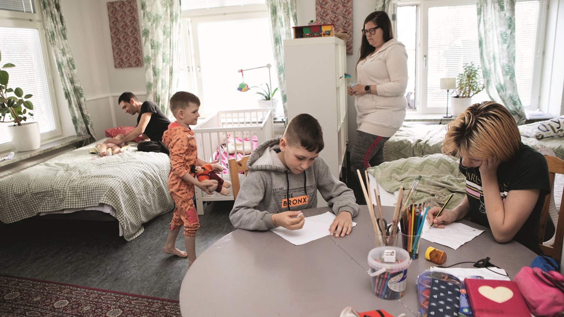 På köksbordet ligger en ukrainsk påskkorg, med målade ägg och en traditionell babka, påskkaka. Den ortodoxa påsken har precis ägt rum. I övrigt är det som att kliva in i en gemensamhetslokal i vilken bostadsrättsförening som helst – förutom att ena halvan av lokalen är fullbelamrad med sängar.