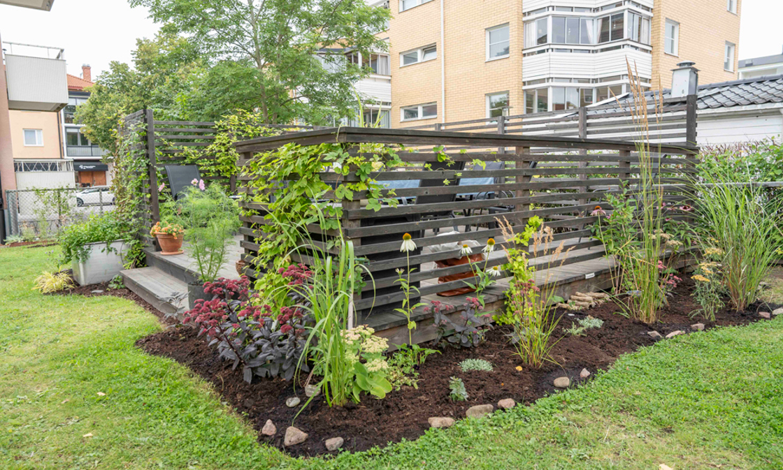 På altanens träräcken klättrar indisk skogsklematis av sorten gouriana, som under sommaren blir översållad av ett hav av vita blommor. Här finns en liten örtagård med mynta och persilja där grannarna gärna plockar kryddor. Som vinnare i Bostadsrätternas tävling fick de ett presentkort på 10 000 kronor i en trädgårdsbutik och dessutom kan Brf Falken 2 nu stoltsera med titeln ”Sveriges finaste innergård”.