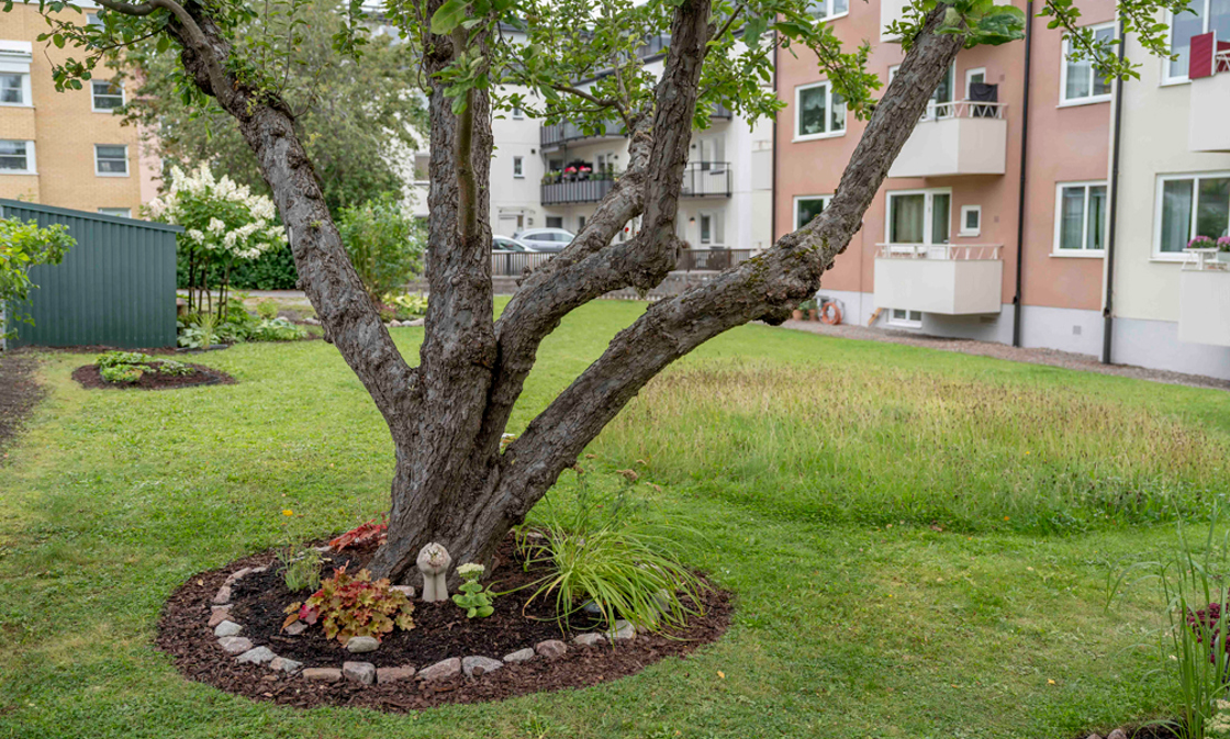 Bakom ett puderrosa hus öppnar sig en grön oas. Här, i Brf Falken 2 i Norrtälje, råder ett stillsamt lugn. Kaukasisk förgätmigej glänser av morgondagg, luften är hög och klar och det doftar friskt av nyskördade äpplen.
