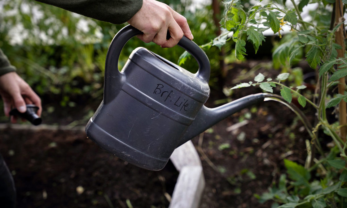 – Vi använder allt regnvatten vi kan ta till vara från alla våra tak. Det känns fel att låta det bara rinna bort, och det minskar vår vattenförbrukning, säger Reine Sterby, som tillsammans med Bozena Wlosinska leder föreningens trädgårdsgrupp.