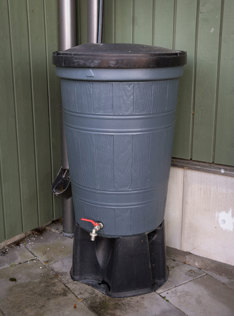 I en tunna på utsidan samlas regnvatten från taket upp – guld värt under torra veckor.